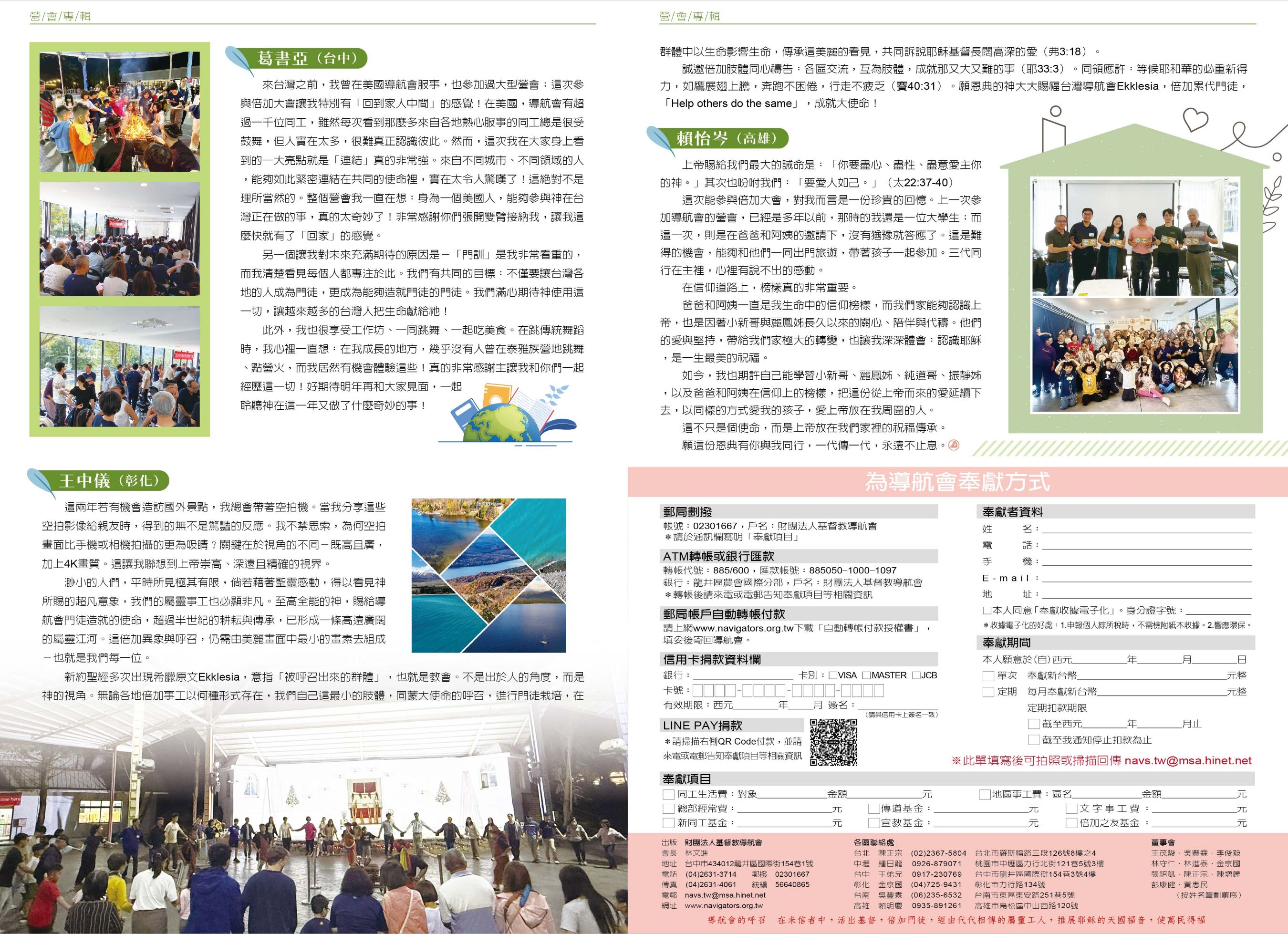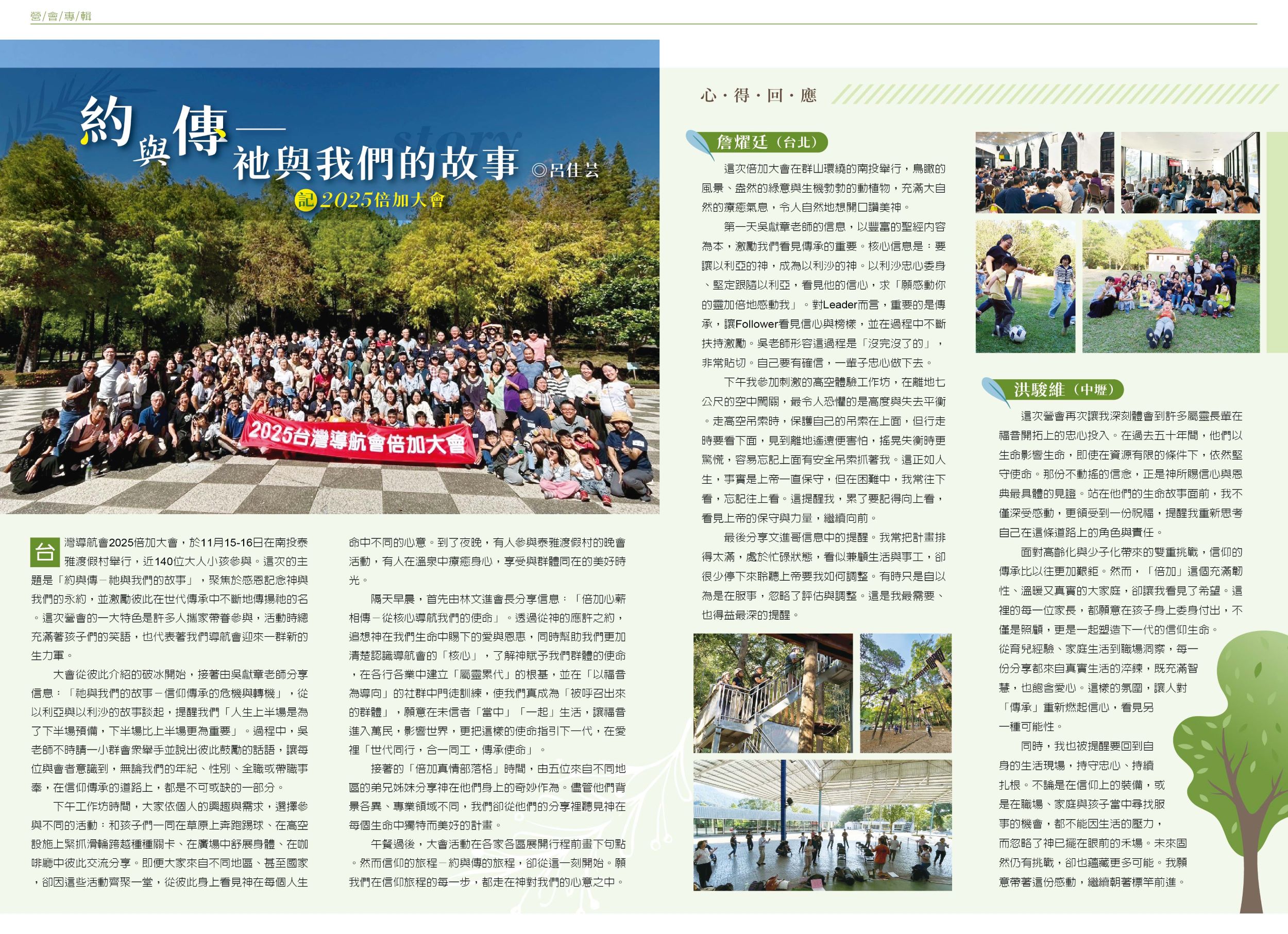 台灣導航會2025倍加大會,於11月15-16日在南投泰雅渡假村舉行,近140位大人小孩參與。這次的主題是「約與傳-祂與我們的故事」,聚焦於感恩記念神與我們的永約,並激勵彼此在世代傳承中不斷地傳揚祂的名。這次營會的一大特色是許多人攜家帶眷參與,活動時總充滿著孩子們的笑語,也代表著我們導航會迎來一群新的生力軍。